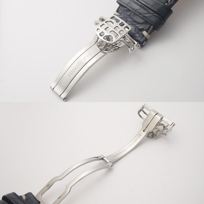 備考:6ヶ月保証付き。クロノグラフ作動中でもリセットボタンを押すとクロノグラフ針が瞬時に0位置に戻り再計測を開始する"フライバッククロノグラフ"機能を搭載した、クラシカルなモデルです。バンドに展示の際についた汚れ・若干のヤケ・やや穴の広がりが見られますが、こちらは未使用品でございます。