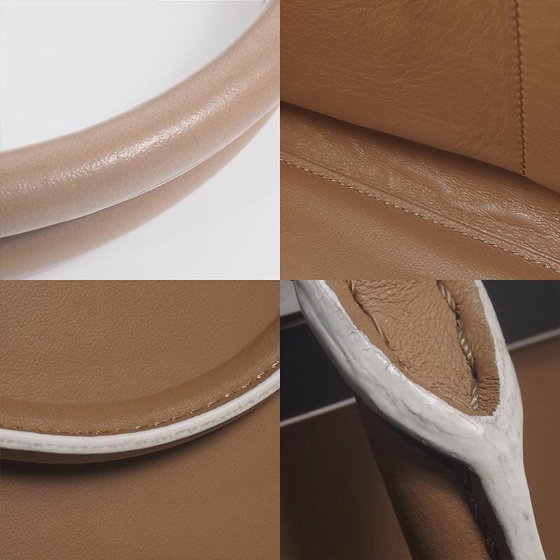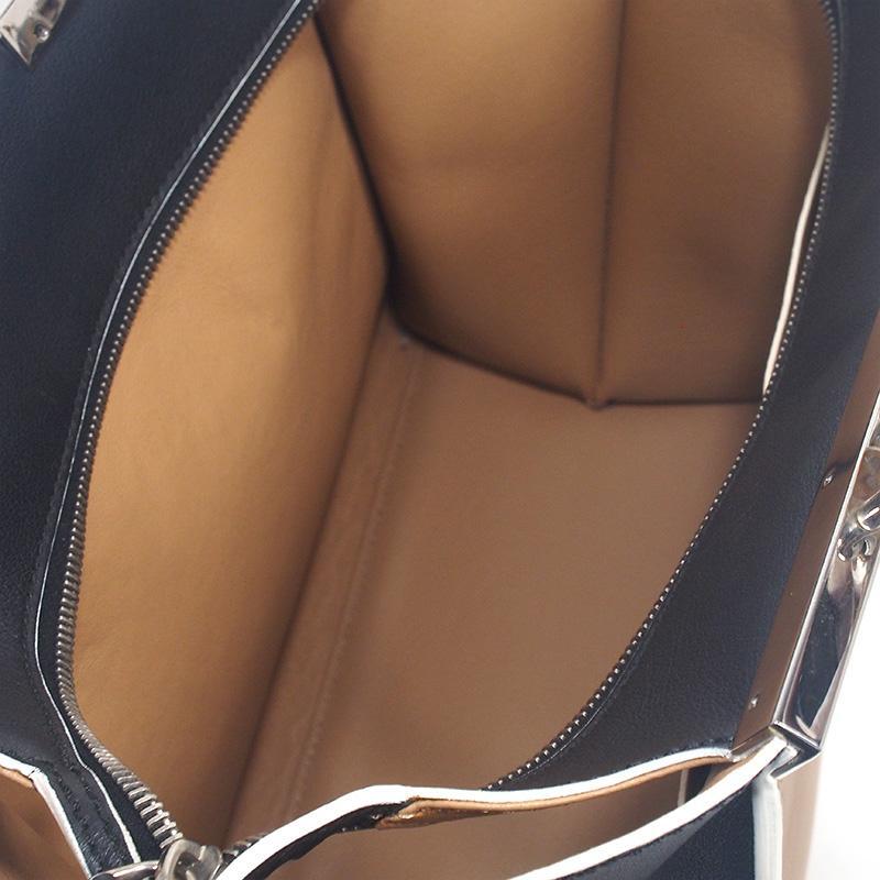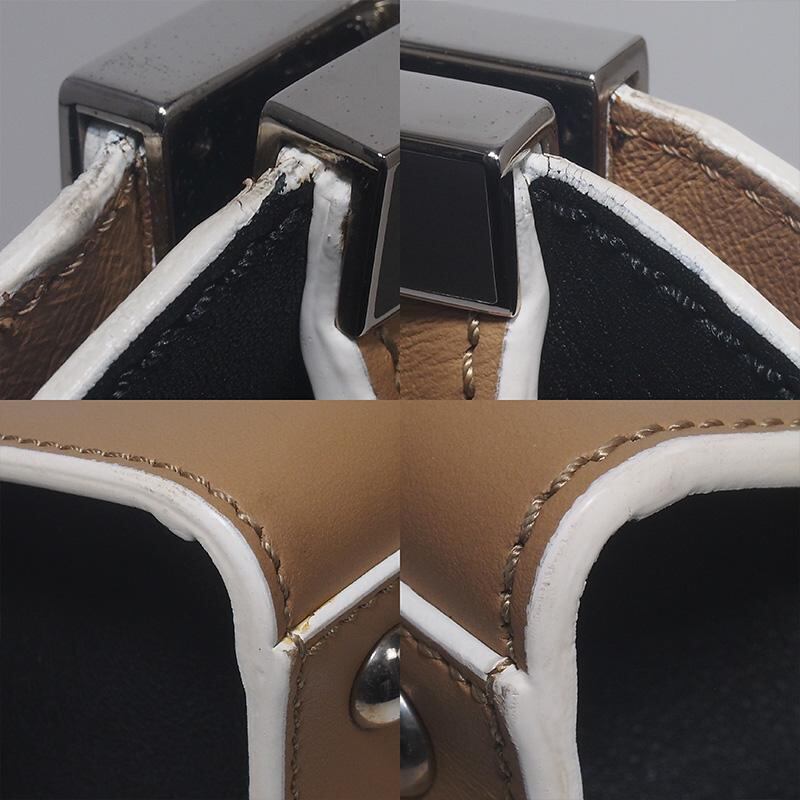 備考:やや大きめのサイズと深めのマチが特徴の「トロワジュール」。かっちりとしたフォルムにツートンカラーを合わせた、シンプルながらも洗練された雰囲気を作り出すアイテムです。金具に傷やスレがあり、内側に跡、コバに汚れとヒビ割れ、角・表面・持ち手に少々汚れが見られますが、お気兼ねなくご使用いただけるお品となっております。