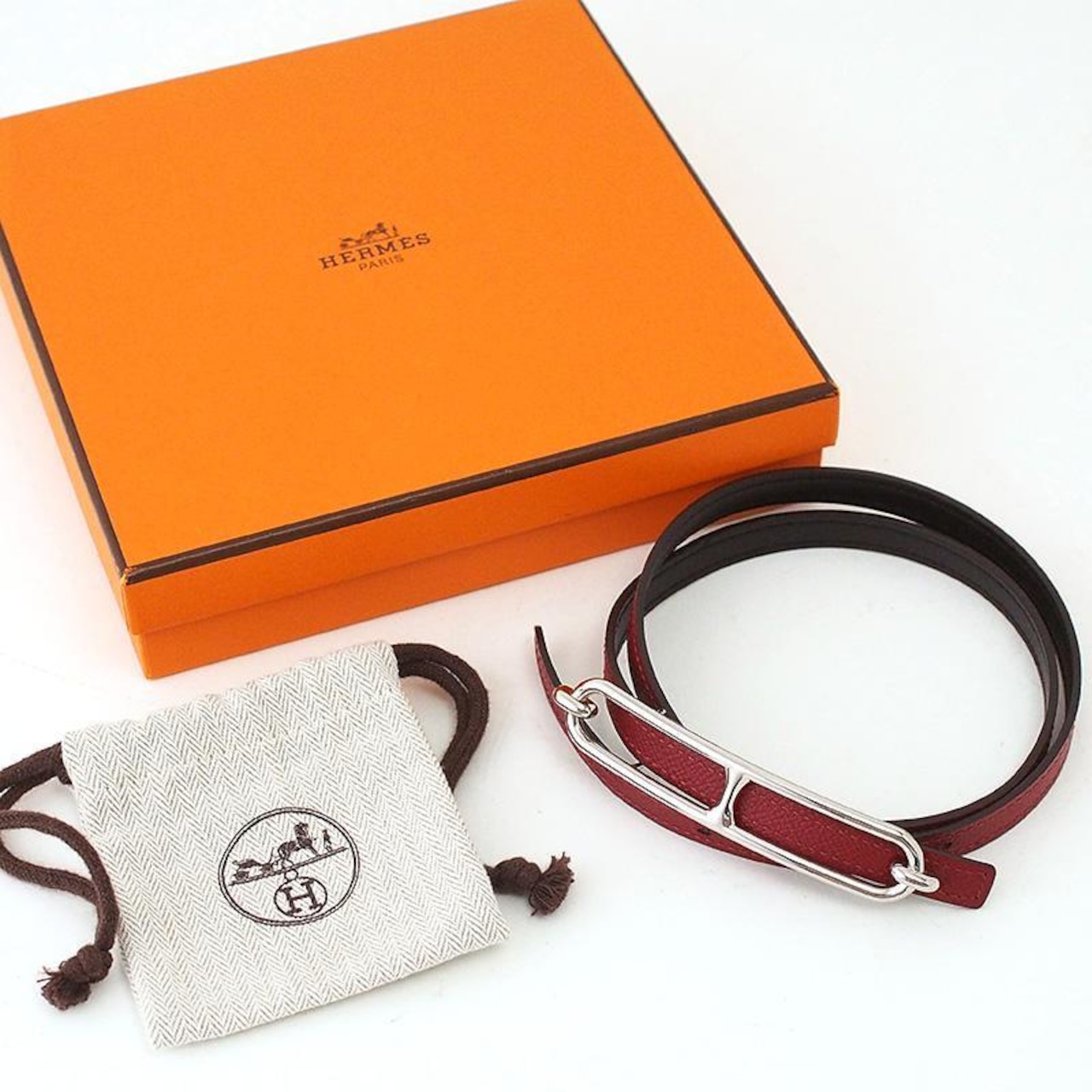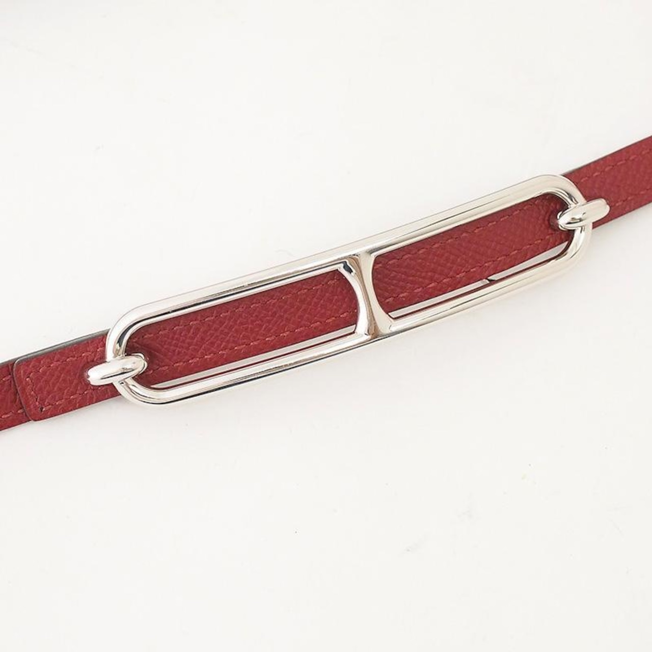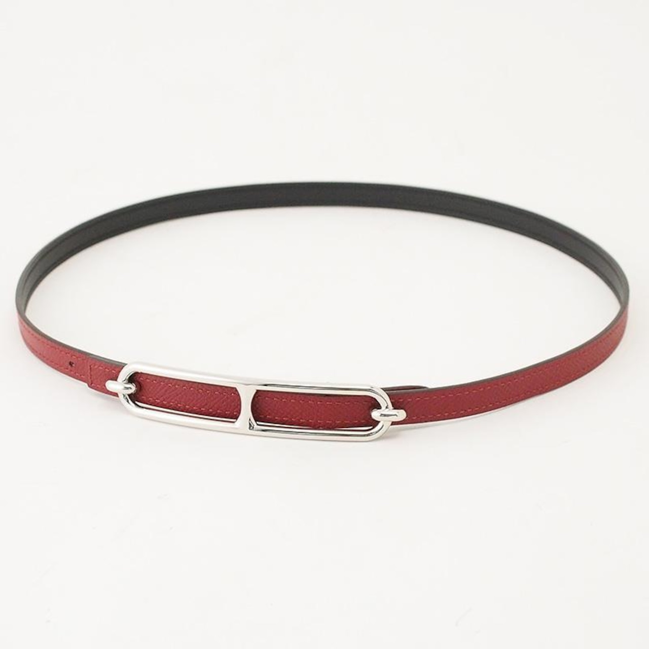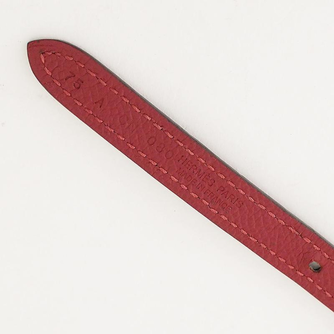 備考:エルメスの卓越したレザー技術とタイムレスなデザインが光るベルトです。華やかなレッド系カラーとスリムなフォルムが、ウエストに上品なアクセントを添えます。バックルに小傷、ベルトに若干の穴の広がりが見られますが、目立つような大きな傷は無く、良い状態のお品となっております。