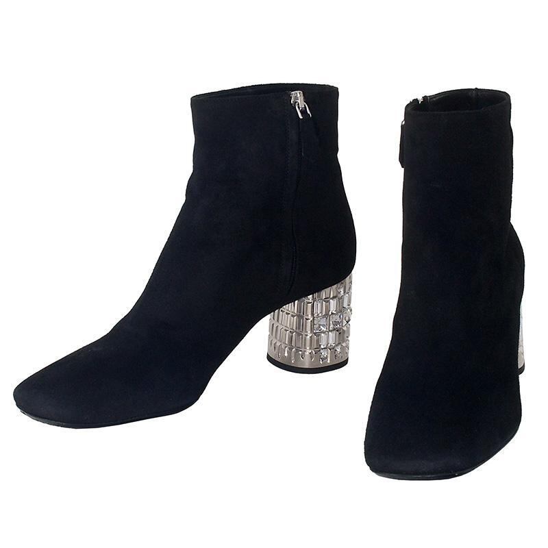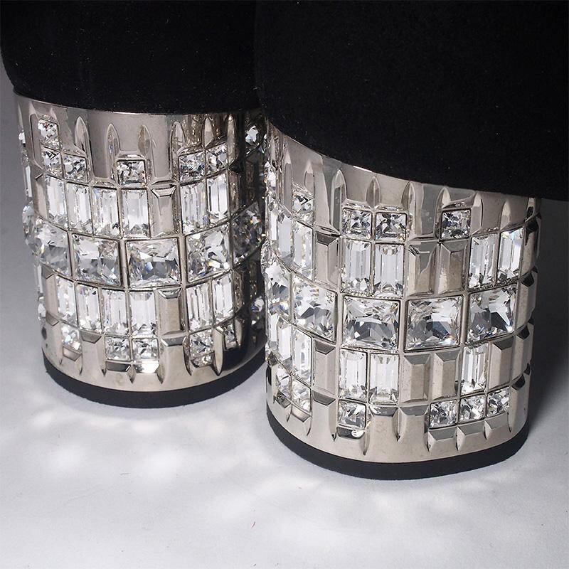 備考:深みのある素材感に、ヒール部分へあしらわれたラインストーンがさりげない輝きを添え、後ろ姿まで印象的に演出します。ファスナー持ち手にわずかなくすみ、ブーツ表面にわずかな汚れがございますが、大きく目立つような傷は無く、良い状態のお品となっております。