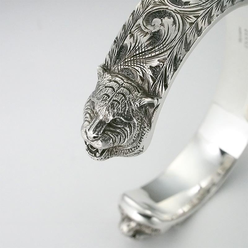 備考:細部まで彫り込まれたアラベスク模様と、立体的なキャットヘッドが印象的なバングルです。シンプルな装いに合わせるだけで、手元に存在感をプラスしてくれます。地金部分にわずかな小傷がございますが、通常使用時に大きく目立つような傷は無く、全体的に良い状態のお品です。