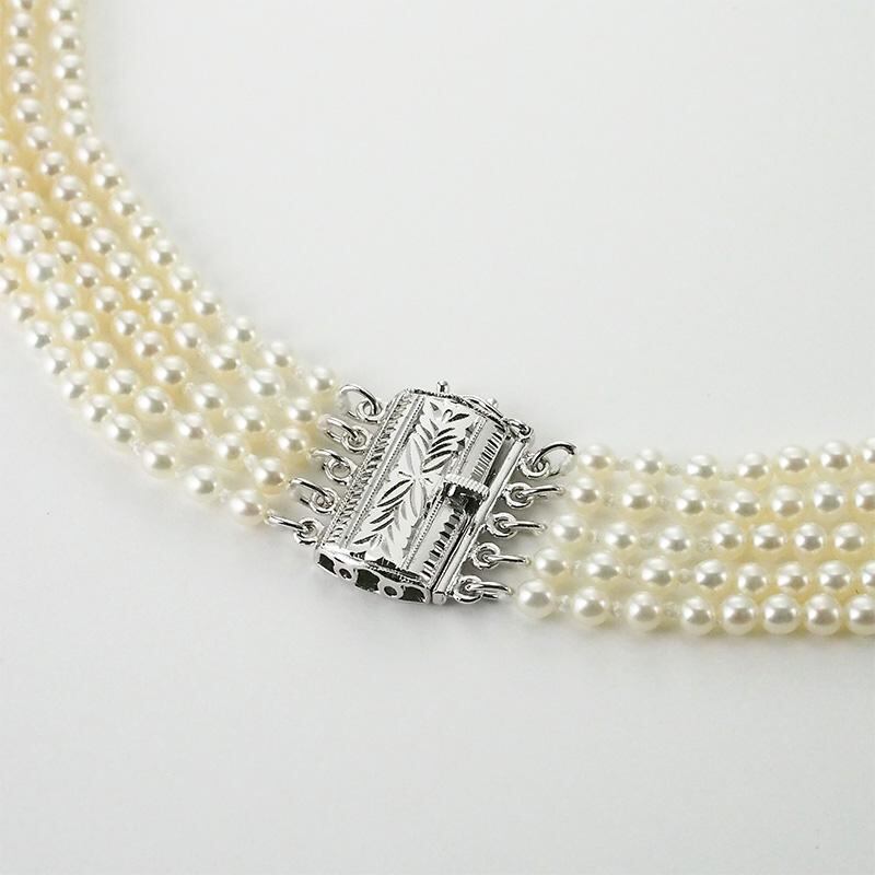 備考:艶やかな淡水真珠を贅沢にあしらった、5連デザインのグラデーションネックレスです。幾重にも重なるパールが織りなす豊かな表情は、首元に華やぎと奥行きをもたらし、ひと目で印象に残る存在感を放ちます。地金部分にわずかな小傷、パール間にわずかな毛羽立ちがございますが、通常使用時に大きく目立つような傷は無く、全体的に良い状態のお品です。