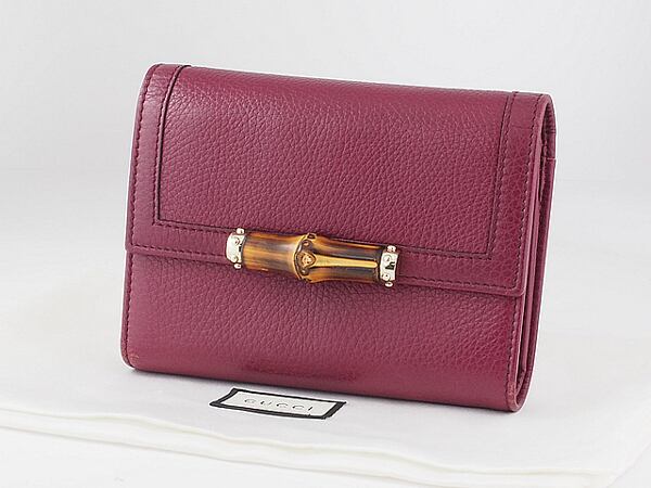 備考:上品なワインレッドカラーのレザーに、グッチを代表するデザインのひとつ「バンブー」をあしらった3つ折り財布です。背面・角・縁・小銭入れ・金具にスレがあり、内側縁に糸の飛び出しが見られますが、通常使用でお気兼ねなくご使用いただけるお品となっております。