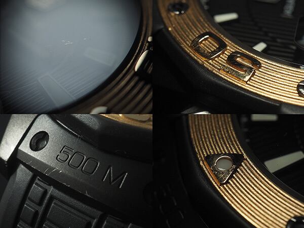 備考:6ヶ月保証付き。ブラックコーティングを施したマットなチタンケースにローズゴールドの逆回転防止ベゼルを搭載した「アクアレーサー」です。ベゼルに擦れや小傷、ラグの一部にコーティングの剥がれが見受けられます。ガラスコーティングに1箇所小さなスレが見られますが、視認性に問題はございません。通常使用時に大きく目立つような傷は無く、良い状態のお品となっております。