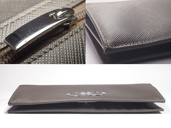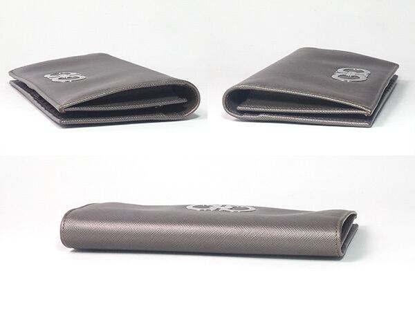 備考:クールなグレーレザーにアイコニックなダブル・ガンチーニの金具が印象的な、フェラガモの2つ折り長財布です。金具に僅かなスレがあり、若干の型崩れが見られますが、通常使用時に大きく目立つような傷は無く、全体的に良い状態のお品です。