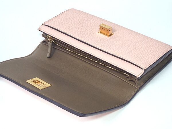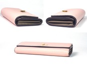 備考:上質なピンクカラーのレザーにゴールドのツイストロック金具が高級感溢れるコンチネンタルウォレットです。金具にスレがあり、小銭入れに跡、フラップ内側と小銭外側に汚れが見受けられます。フラップコバに若干の割れが見られますが、大きく目立つような傷は無く、良い状態のお品となっております。