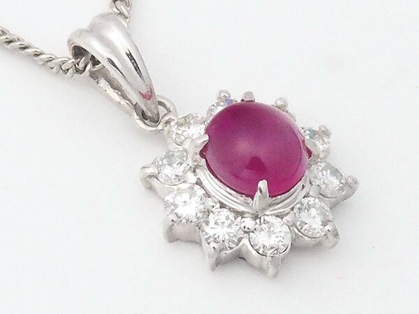 備考:表面の滑らかなカボションカットのルビーと煌めくダイヤモンドをあしらったプラチナ900製のトップに、プラチナ850製のチェーンを組み合わせた上品かつエレガントなネックレスです。バチカンに小傷があり、留め具に僅かな擦れが見られますが、通常使用時に大きく目立つような傷は無く、全体的に良い状態のお品です。