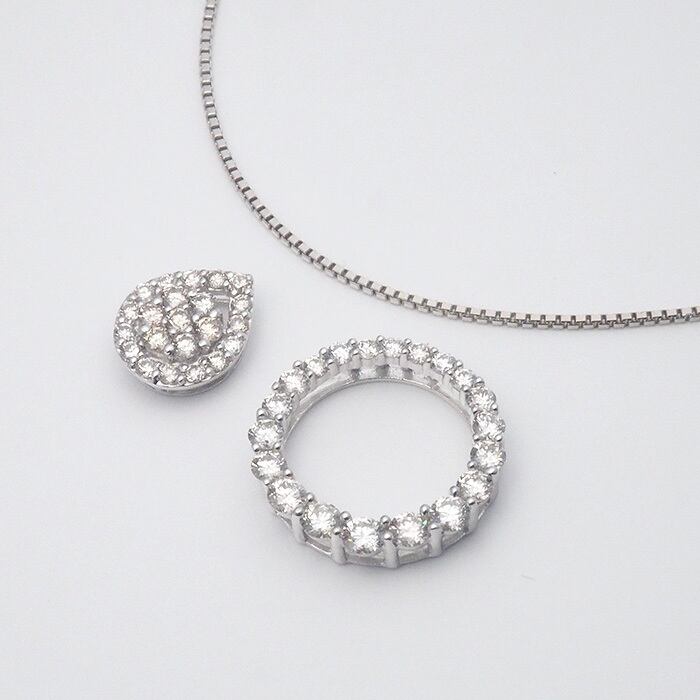 備考:サークルモチーフと雫モチーフに煌めくダイヤモンドをセットした、18金ホワイトゴールド製のネックレスです。トップはそれぞれ取り外しが可能で、3WAYでお楽しみいただけます。留め具に若干くすみがあり、僅かなスレが残っておりますが、こちらは仕上済商品の為、状態の良いお品でございます。