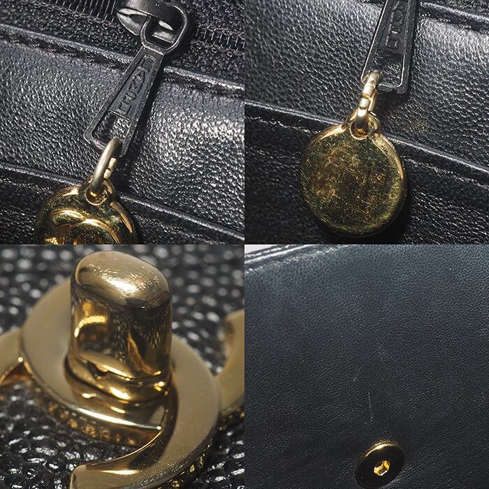 備考:高級感あるブラックのキャビアスキンにゴールドのココマーク金具が上品なハンドバッグです。シリアルNoは「931****」です。角・内側・ファスナー引手に少しスレがあり、金具にスレと小傷が見られますが、大きく目立つような傷は無く、良い状態のお品となっております。