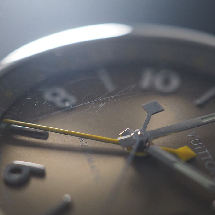 備考:6ヶ月保証付き。2002年のコレクション誕生以来人気が高く、定番として存在し続ける「タンブール」。こちらは優しい風合いのサーブルフェイスにイエローのGMT針を組み合わせた自動巻きモデルです。全体的に小傷、ガラスコーティング膜とバックルにスレ、裏蓋に小スレが残っておりますが、こちらは仕上済商品の為、状態の良いお品でございます。